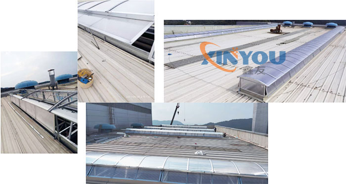 2. 圓拱型電動采光排煙天窗主要材料通常采光不同規格的鋁型材,采光材料一般使用PC陽光板或FRP采光板,天窗頂部為拱型,其好處是可以折射陽光擴大室內采光面積,且拱型的窗面利于夏季排雨,冬季又不易積雪,本身的自潔性較好,表面浮塵雨水沖刷,經常保持較好的采光效果。