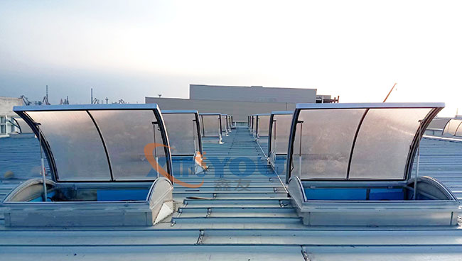 圓拱形的設計,外觀優美、通風排煙兼顧自然采光,可實現消防聯動控制,開啟角度一般為30度到45度***開啟角度為90°。 夏季有利于排水,冬季不積雪。采用單開或對開形式。天窗啟閉按群組控制,每組天窗數根據天窗數量及控制距離決定。