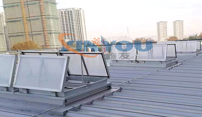 鑫友工業類電動消防排煙天窗主要適用于廠房等工業類大型建筑的屋頂采光、通風、排煙,設計依據建筑標準設計圖集09J621-2。
